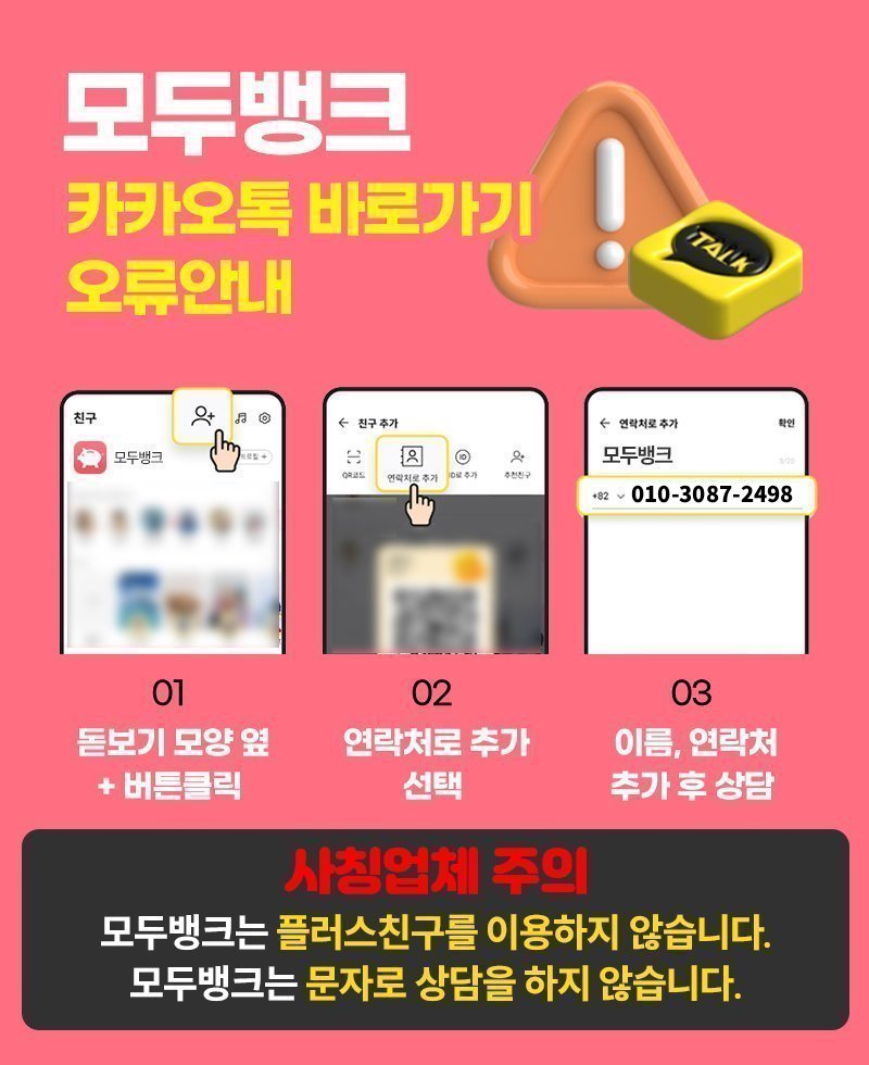 모두뱅크는 플러스친구 운영을 하지 않습니다. 이용에 각별히 주의 부탁드립니다.